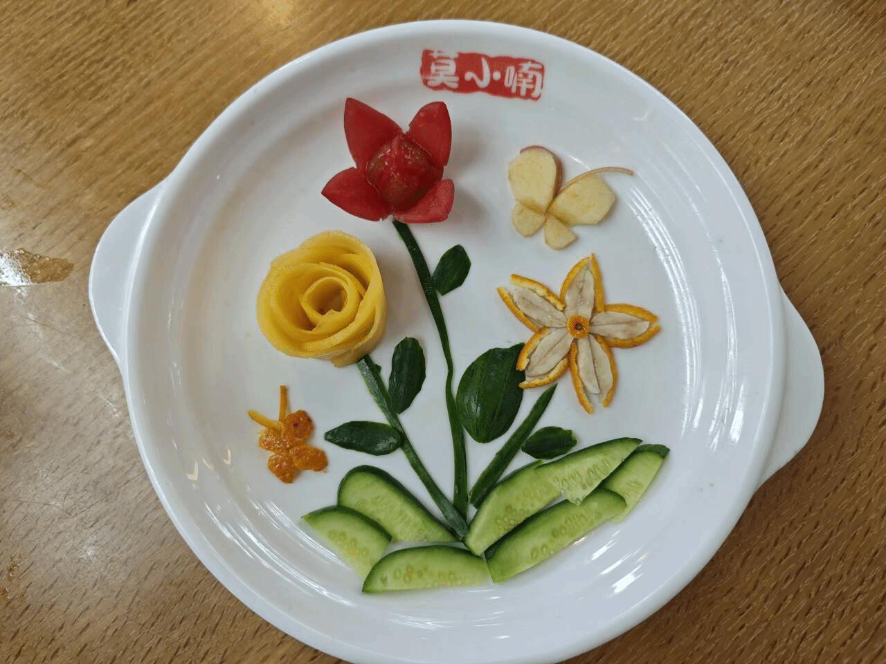 在水果拼盘设计环节中,食堂里“热闹非凡”。学生们在手机上搜索水果拼盘图片,并与拥有的材料进行对比,确定拼盘图案后,进行分工合作。经过切割图形、雕刻图案、精心摆盘等步骤,一件件艺术品“新鲜出炉”,“麦当劳薯条”、“郁金香”、“天鹅”……不同的水果拼盘形象纷纷呈现在盘子中。