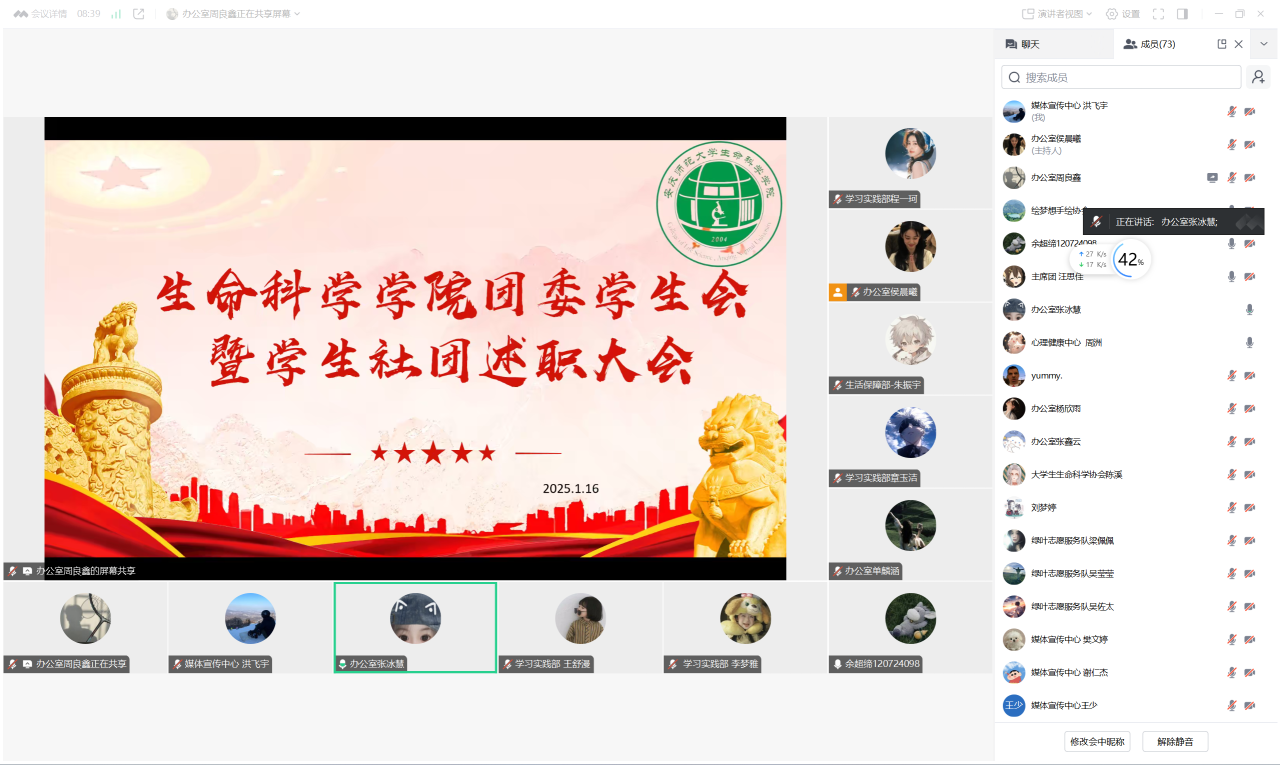 1月17日,英国365集团公司线上召开2024年度学生组织述职评议会议。院团委负责老师及各学生组织负责人参加述职评议大会。
