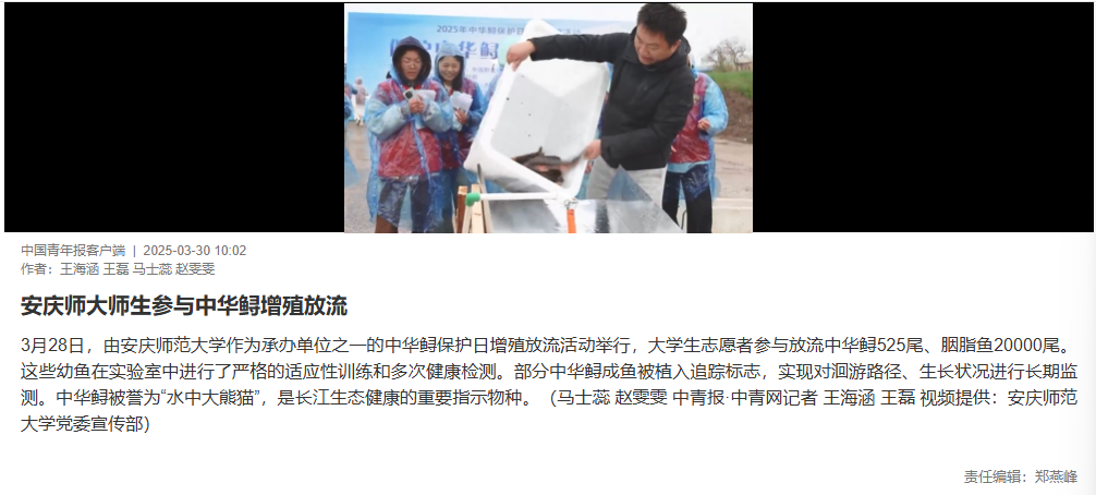 3月28日,由365英国上市公司在线作为承办单位之一的中华鲟保护日增殖放流活动举行,大学生志愿者参与放流中华鲟525尾、胭脂鱼20000尾。这些幼鱼在实验室中进行了严格的适应性训练和多次健康检测。部分中华鲟成鱼被植入追踪标志,实现对洄游路径、生长状况进行长期监测。中华鲟被誉为“水中大熊猫”,是长江生态健康的重要指示物种。(马士蕊 赵雯雯 中青报·中青网记者 王海涵 王磊 视频提供:365英国上市公司在线党委宣传部)