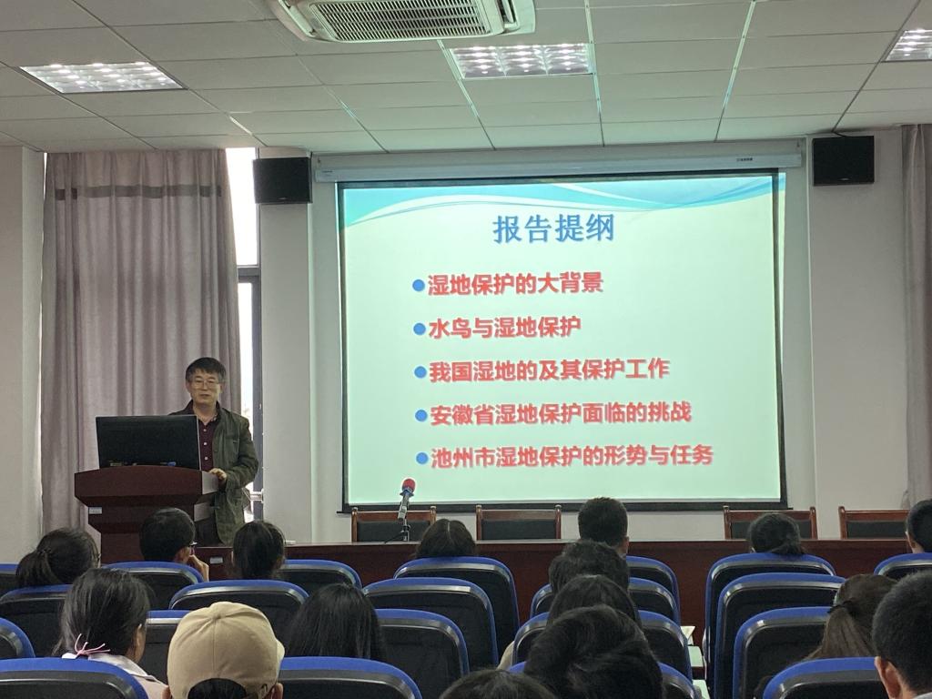 周教授就《安徽湿地保护修复模式的探索与实践》做了详细讲解。具体介绍了什么是湿地,湿地的类型和生态过程,湿地的重要性和保护,以及国际国内湿地保护大背景。报告还就安徽湿地的现状,深入探讨了安徽湿地保护面临的挑战和保护任务的艰巨性。报告结束后,我院与会师生与周教授就湿地保护问题进行了探讨和交流。(英国365集团公司 陈敏敏)