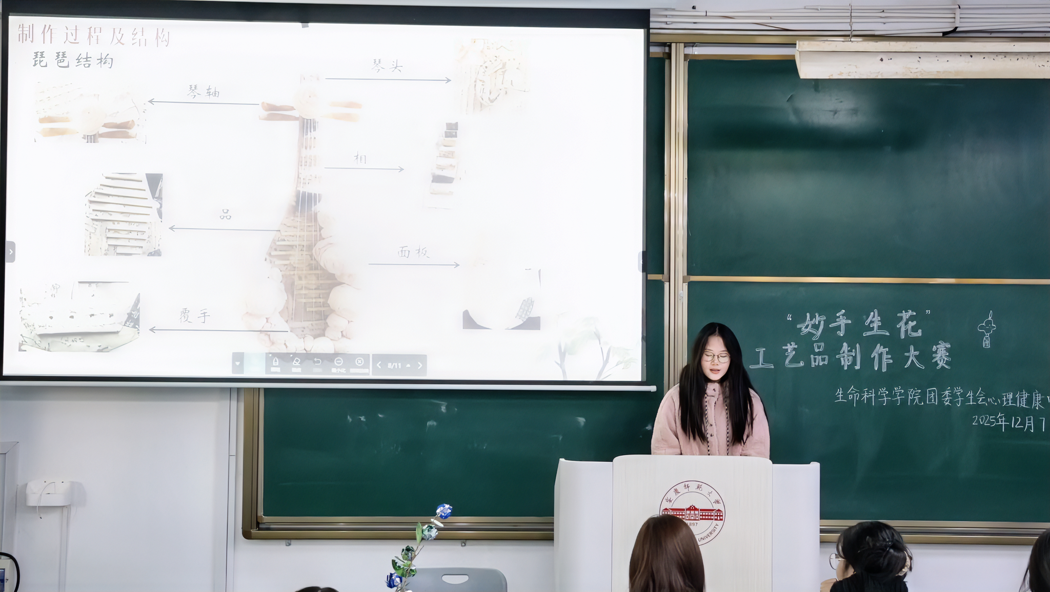 阳光落在相框内玻璃蝴蝶的翅膀上,折射的光影好似给了“蝴蝶”再一次翩翩起舞的舞台...活动伊始,来自24级生物科学四班的檀依灼带着充满创意的PPT及作品“半蝶琉璃梦”登台进行了汇报。檀依灼这样说到:“我想通过这件作品表达出不掩饰破碎,不回避残缺,重组是为了更美的未来这一核心观点。”其团队所带来的作品融合蝴蝶、叶片等自然元素坚定贯彻了源于自然归于生活的创作理念,在情感上引起共鸣的同时,成果引导了大家接受自己的“不完美”。比赛中这样富含深意的作品比比皆是,其中有的利用落叶制作了承载奇思妙想的魔法帽,有的利用废弃纸张和水晶制作了桌面摆件,有的......