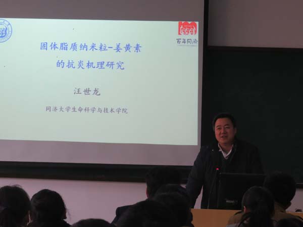 12月25日下午,同济大学生命科学与技术学院副院长汪世龙教授在G106教室作了题为"固体脂质纳米粒姜黄素的抗炎机理研究"学术报告。学术报告由英国365集团公司吴甘霖院长主持,英国365集团公司部分老师和学生听取了报告。