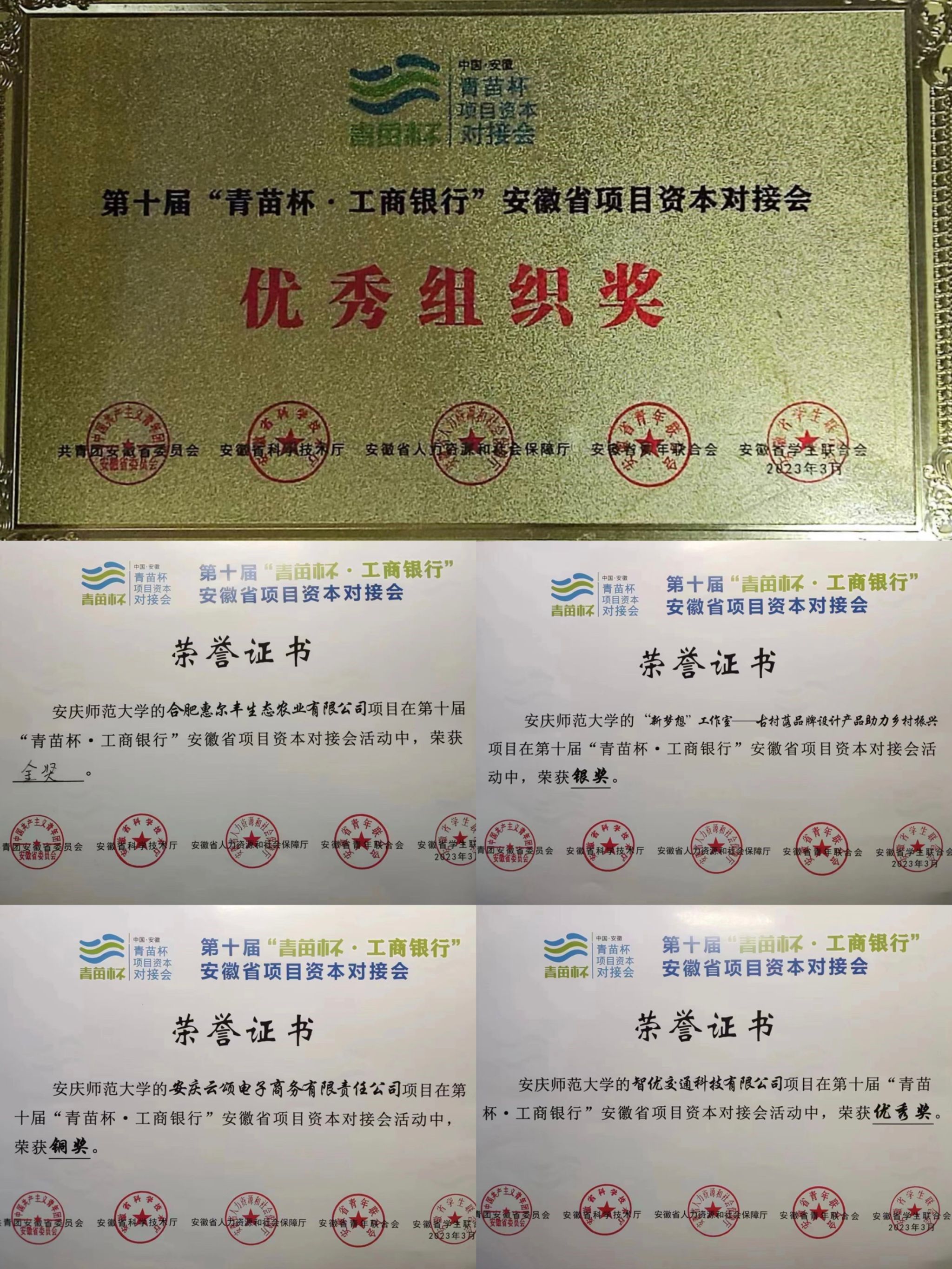 3月2日,第十届“青苗杯”安徽省项目资本对接会在合肥中安创谷科技园举办。我校学生创业项目获金奖1项、银奖1项、铜奖1项、优秀奖1项,学校荣获“优秀组织奖”。