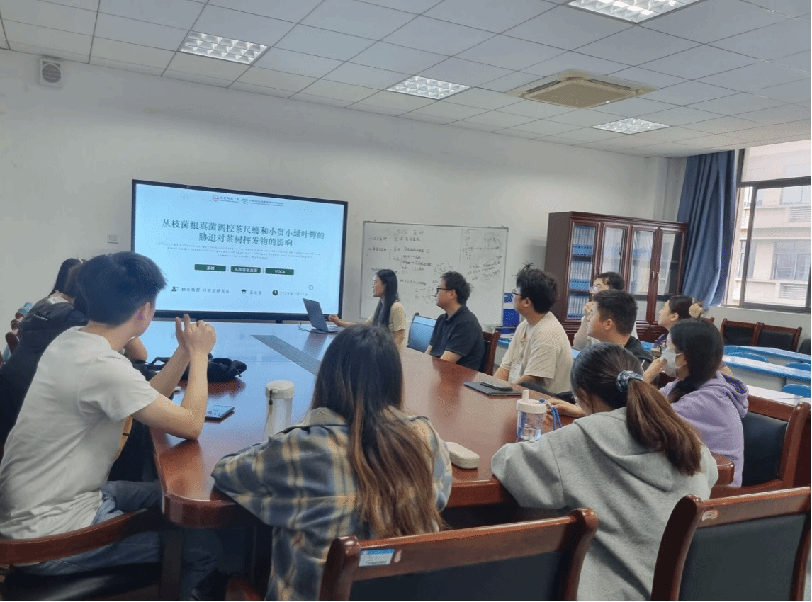 王玉玺同学分享了他的硕士论文《丛枝菌根真菌调控茶尺蠖和小贯小绿叶蝉的胁迫对茶树挥发物的影响》。他重点讲述了论文的整体框架和采样周期中关键时间节点的选择,为在场的同学们提供了宝贵的科研经验。