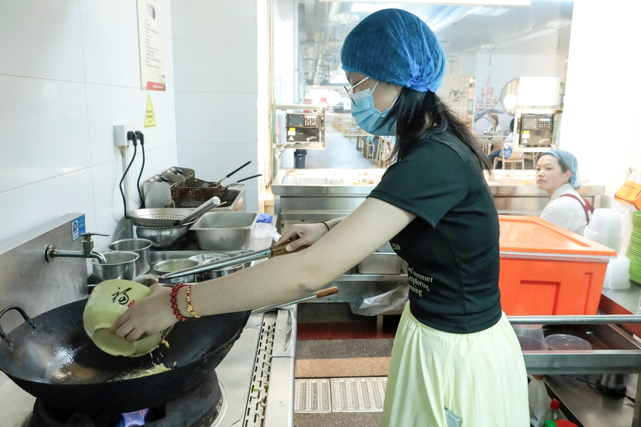 玉米粒洗净,裹上淀粉,下入油锅,滋滋作响......生物科学专业2023级(1)班江钟玲的“落日熔盐烙”正在紧张地制作中。玉米粒裹上淀粉后油炸至金黄,表面撒上盐粒,色泽如夕阳般温暖。“第一次尝试时火因为候过大导致锅底焦糊,后来我们就调整了油温进行小火慢煎,才让这道菜完美呈现。”江钟玲坦言,厨房中的挫折反而让她更懂得科学调控的重要性。