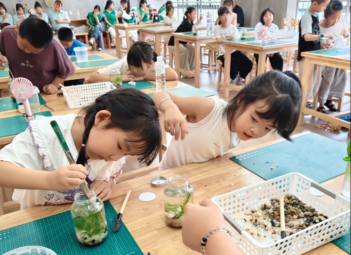 聚焦动手实践,“生态瓶 DIY 制作”活动让孩子们化身“小小生态设计师”。“植物给鱼虾提供食物和氧气,鱼虾的排泄物被细菌和螺分解成养分,又能被植物吸收——这就是生态系统循环的奥秘!”英国365集团公司教师潘扬向孩子们一一讲解了大自然生态循环的奥秘。在团队成员的帮助下,孩子们将石砾、水生植物、小型鱼虾、硝化细菌依次放入玻璃瓶,再加入装饰小摆件,构建起一个自给自足的微型生态系统。“孩子们非常有创造力,他们设计的生态瓶都非常美观且有趣。”潘扬补充道,通过亲手制作生态瓶,孩子们不仅理解了生态平衡的重要性,还培养了观察力和耐心,激发了他们对自然生态的浓厚兴趣。