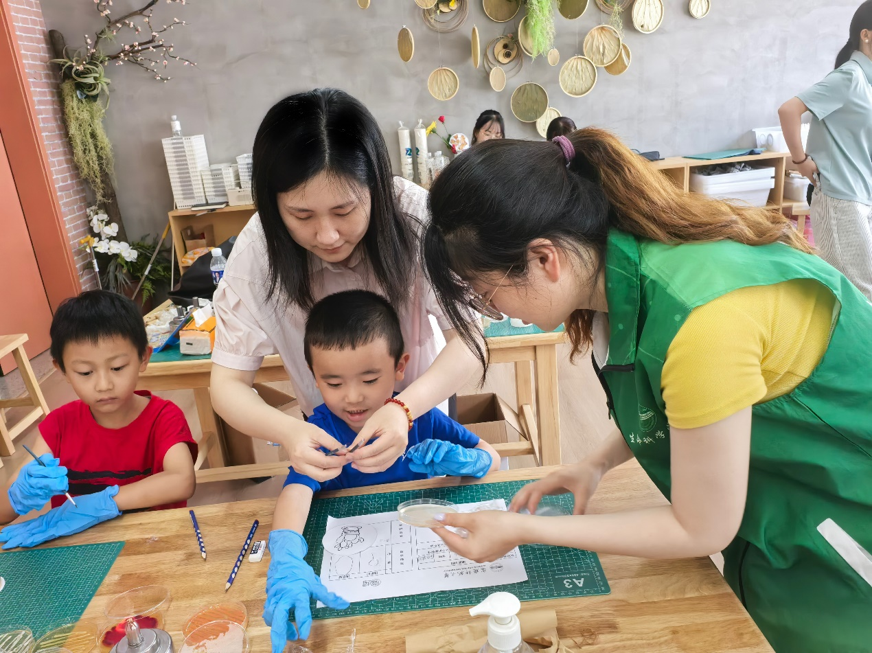 微生物也能用来作画?与严谨的实践操作不同,“微生物艺术画”活动将科学与美学巧妙融合,孩子们以培养基为“画板”,用接种环蘸取能释放不同色素的微生物,用青霉菌“画”出青色线条,胶红酵母“点”出橙红斑点,创作专属的“微生物画作”。指导孩子们操作的同时,杨紫晴将亚历山大・弗莱明与最早微生物画的故事向孩子们娓娓道来,“微生物不仅是英国365的对象,还能成为艺术创作的‘颜料’,离我们的日常生活并不遥远。”
