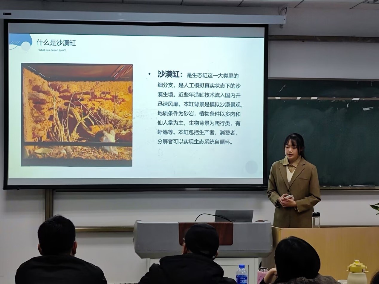 “借用诗词《春泛若耶溪》,我们希望通过此作品在深秋转冬的季节也能挽留一缸春色。”从生态缸的定义、制作所需材料到生态缸基本制作过程、预计效果,精美而富有意境的ppt涵盖方方面面,参赛团队在制作的初期就尽可能考虑各种情况。伴随着悠扬的音乐旋律,参赛人员将团队设计理念娓娓道来,让在场观众对作品模型有初步了解。