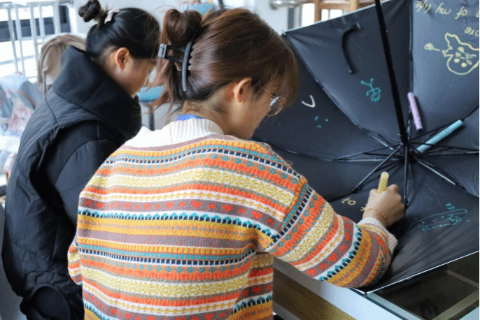 活动负责人、生物科学(师范)专业2022(4)班的曹张婷表示,活动通过在共享雨伞内部绘制图案,书写话语,给使用者带来一些生活的乐趣和启示,“大龙山的冬天多风多雨,我们希望这些雨伞能给需要的人带去帮助与慰藉。”
