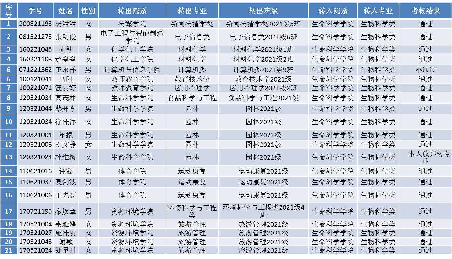 根据《365英国上市公司在线全日制本科学生转专业管理办法》(校政字[2021]20号)文件和英国365集团公司转专业工作方案,2021年12月15日(星期三)下午,英国365集团公司转专业考核工作组,本着公开、公平、公正的原则,在纪委监督下,对申请转入英国365集团公司的21名同学(其中拟转入生物科学类21人)进行了面试。现将英国365集团公司2021-2022学年转专业学生考核结果公示如下: