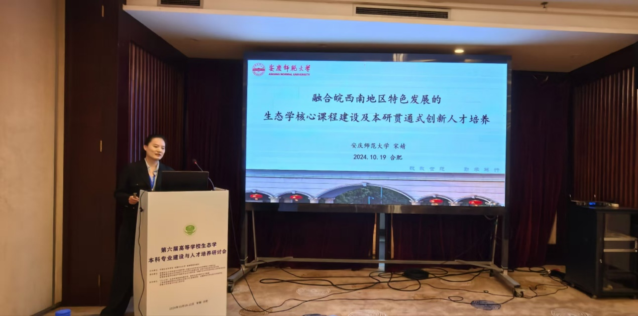 我院生态学专业负责人和教研室主任,宋婧博士做了题为“融合皖西南地区特色发展的生态学核心课程建设及本研贯通式创新人才培养”的学术报告。报告围绕皖西南地区特色与生态学的关联、专业建设方向设置和本研贯通式创新人才培养等方面展开。