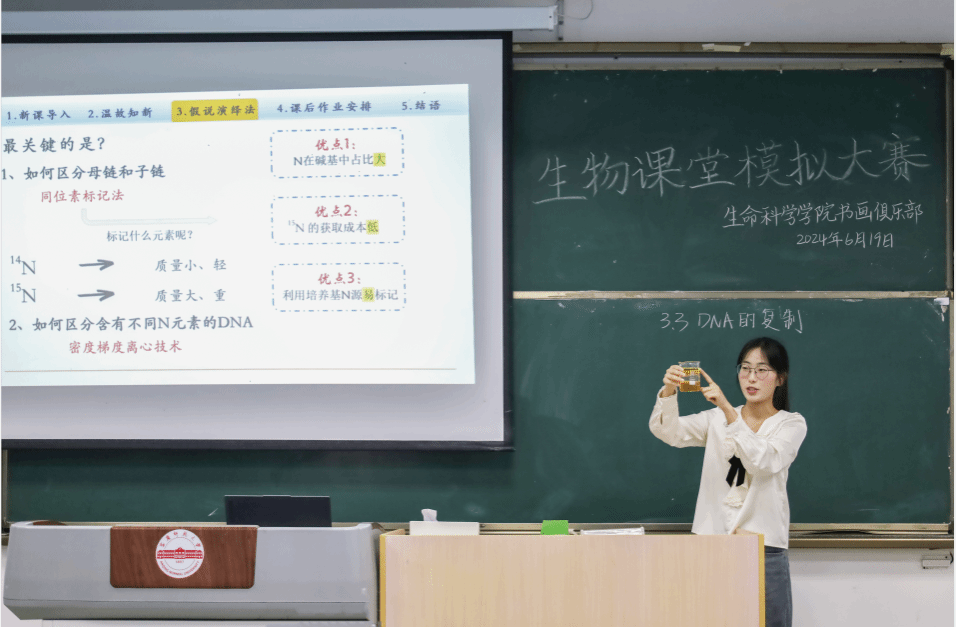 “为了让大家更明显更直观地了解密度梯度离心实验,我做一个模拟实验。”生物科学专业2022(6)班的徐颖睿端起盛有油、水、蜂蜜混合物的烧杯,并分别放入红色导线、火柴以及导线与火柴的结合物,生动地向现场的评委和学生展示实验现象。她表示,此次比赛提高了她制作PPT的能力,锻炼了心理素质,进一步强化了她的专业知识,未来,她将把所学的专业知识和技能应用于生物学教学和科研工作中,通过教学培养更多的生物学人才。
