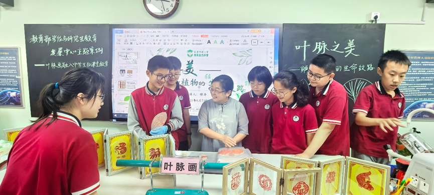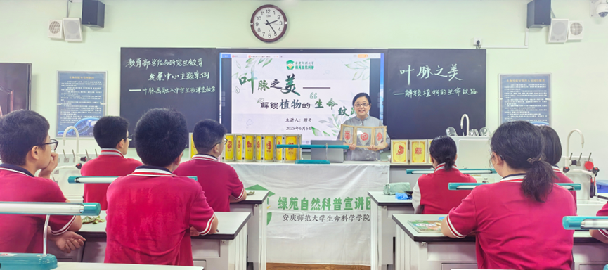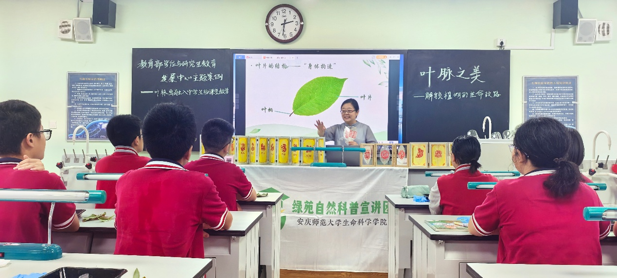 教育部2024年度主题案例“叶脉画融入中学生物课堂教学”,于近日在安庆市第四中学八年级生物学课堂中开展。本次示范课为响应安徽省植物学会的号召,以 “叶脉之美——解锁植物的生命纹路” 为主题,以生物学学科核心素养为引领,创新性地将非物质文化遗产“叶脉画”技艺与中学生物学教学深度融合,旨在构建“科学探究+艺术创作+劳动实践”三位一体的特色教学模式。