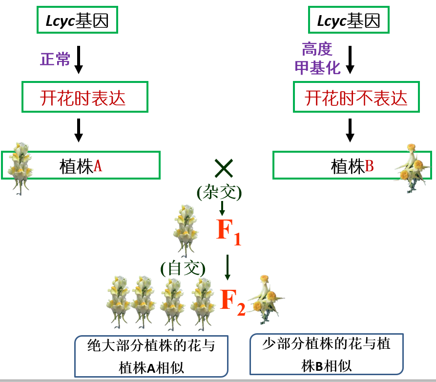 2.资料1中,F1的花为什么与植株A的相似?在F2中为什么有些植株的花与植株B的相似?