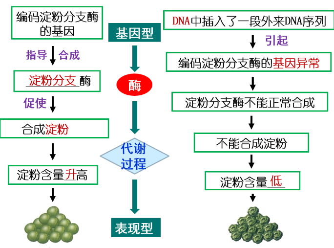 原来,圆粒豌豆的DNA中有一个控制编码淀粉分支酶的基因,淀粉分支酶可以控制淀粉的合成,淀粉的吸水性比较强,豌豆会因为淀粉吸水而膨胀,表现出圆粒的特征。而皱粒豌豆的DNA比圆粒豌豆的DNA多了一段外来的DNA序列,打乱了编码淀粉分支酶的基因。最终淀粉分支酶不能形成,导致细胞内淀粉含量也大大降低,所以豌豆就表现出皱缩。