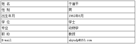 于道平,汉族,安徽无为人,教授,硕士生导师。现为水生生物保护与水生态修复安徽省高等学校工程技术研究中心主任,兼任生态环境部评估中心和农业农村部环境影响评审专家、安徽省动物学会常务理事、阿拉善SEE长江生态保护中心专家委员、安徽省大水面生态渔业专家组成员。主要从事鲸类生态学研究,获安徽省科学技术进步三等奖、农业农村部长江江豚保护先进个人、安徽省教育工委优秀共产党等荣誉。