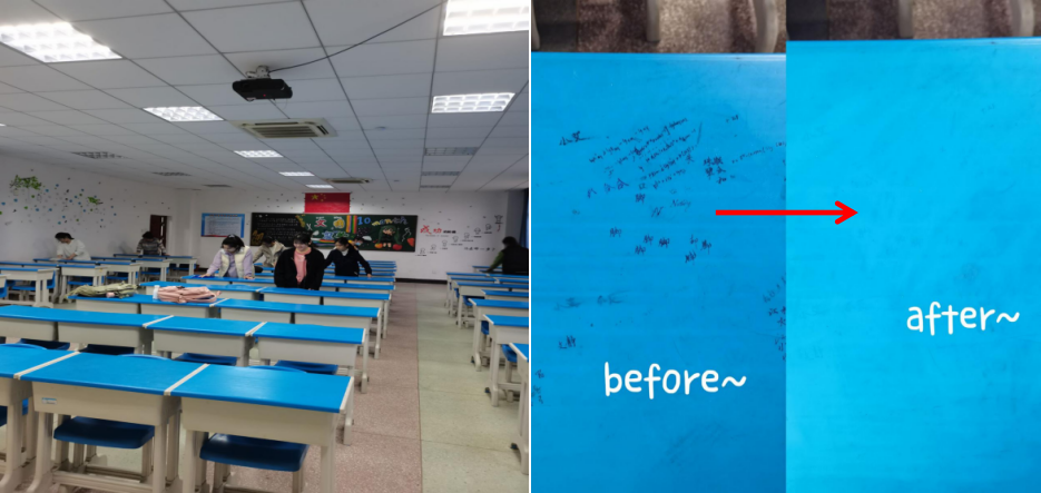 为将雷锋精神付诸于实际行动,生物科学类的十几位志愿者对英国365集团公司教室的桌椅进行清理。将桌面上的涂鸦、修正带痕迹等处理干净,并将桌椅摆放整齐,学院教室焕然一新。同学们还给每个教室的讲台上放置了绿植,给教室添上了一抹绿色,让老师们在讲课时也能有舒适的环境。通过此次活动,让同学们领会到了劳动教育的深刻内涵和时代价值,也体会到奉献的快乐。