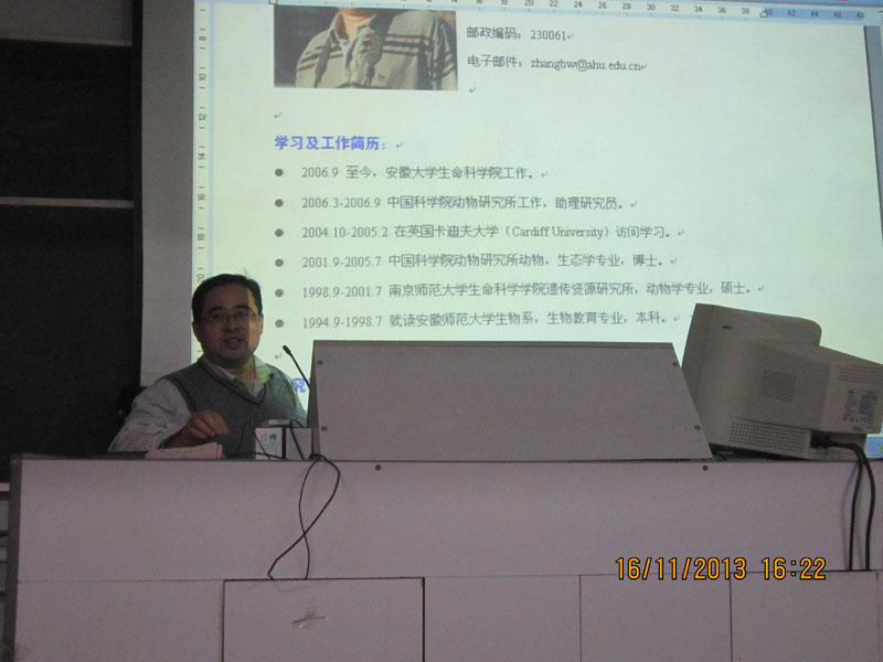 11 月 16 日 下午,中国动物学会两栖爬行动物学分会理事、安徽大学张保卫博士应邀在菱湖校区414教室作了“长江中下游区域小麂系统地理和群体遗传学分析:基于mtDNA控制区序列变异”专题学术讲座。英国365集团公司100多名师生聆听了报告,报告会由英国365集团公司副院长魏和平博士主持。