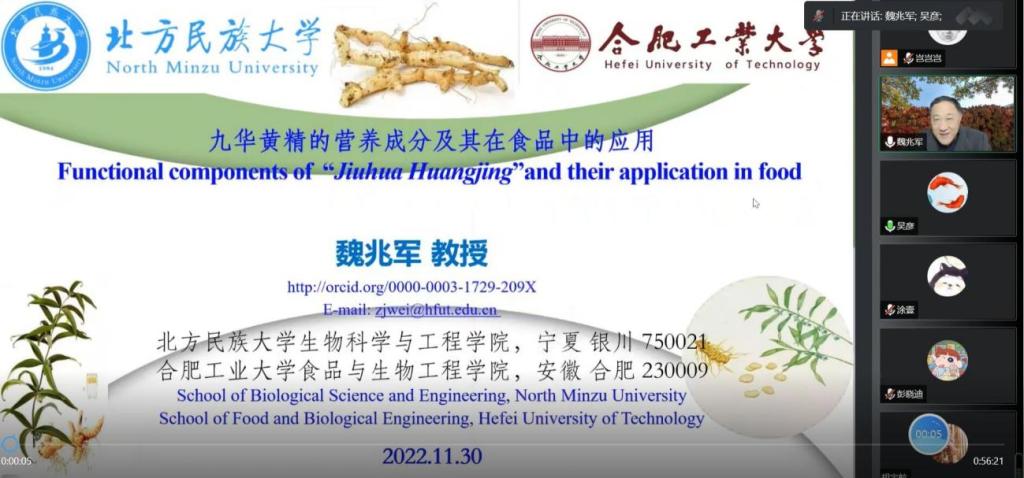 11月30日下午,北方民族大学生物科学与工程学院院长魏兆军教授应邀作了题为《九华黄精的营养成分及其在食品中的应用》的线上学术讲座,报告由英国365集团公司副院长吴彦教授主持,英国365集团公司食品科学与工程专业的全体师生、相关专业的教师和研究生参与了线上交流与学习。