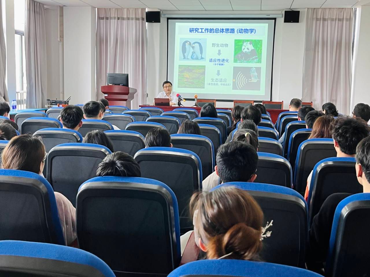赵华斌教授详细阐述了动物食性是构建其物种多样性的关键因素,对物种生存至关重要。报告聚焦脊椎动物食性多样性的分子演化研究,从动物选择食物、消化和代谢食物、营养与免疫等角度,探讨了味觉受体基因的功能演化促进脊椎动物食物选择的分子机制,解析了多个消化酶、代谢基因和免疫基因在动物食性适应中的关键作用。赵华斌教授指出,免疫基因的快速演化是动物适应腐食和素食的重要原因之一,并评估了食性很可能不是动物易感特定病毒的原因。报告结束前,赵华斌教授还与现场师生开展了互动交流。